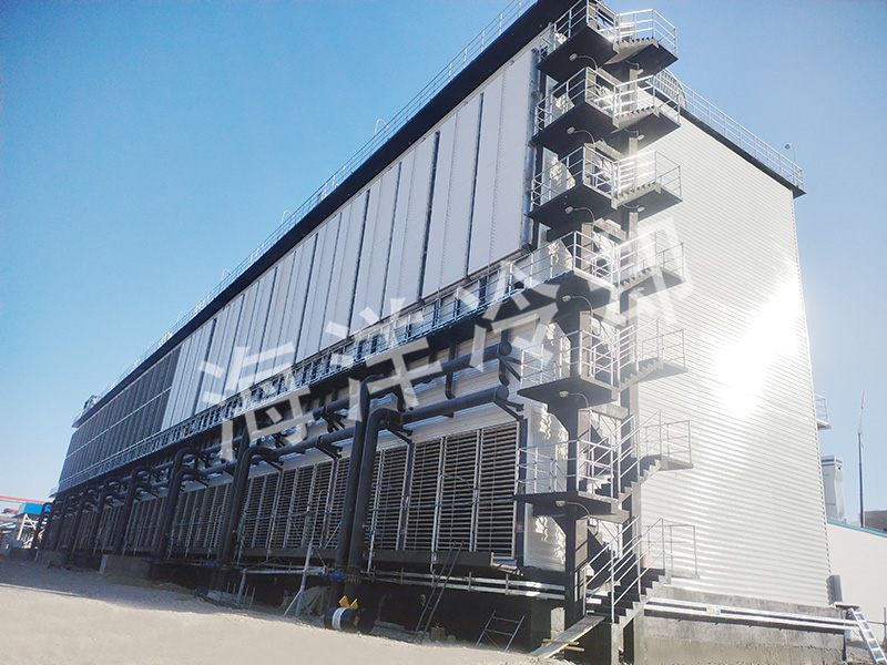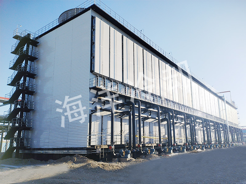 高温工艺流体先进入干冷翅片管束进行冷却,然后再串联进入蒸发湿冷盘管部分,被进一步冷却后流出。喷淋水从集水槽由喷淋水泵送至湿冷蒸发盘管上方的喷淋水分布系统。在喷淋水润湿的蒸发盘管表面进行蒸发换热,喷淋水经过盘管后下落至集水槽。流经盘管的空气被蒸汽饱和并带走热量,同时风扇对翅片管内的流体进行冷却。